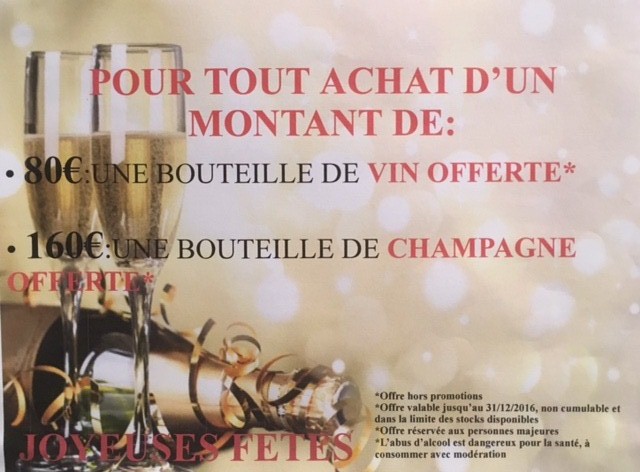 POUR TOUT ACHAT A PARTIR DE:   80€: UNE BOUTEILLE DE VIN OFFERTE* 160€: UNE BOUTEILLE DE CHAMPAGNE OFFERTE* *Offre non cumulable et dans la limite des stocks disponibles *Offre réservée aux personnes majeures *L'abus d'alcool est dangereux pour la santé, à consommer avec modération *Offre h...